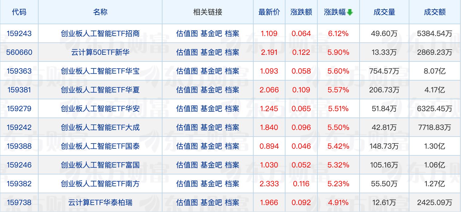 具体来看,创业板人工智能相关ETF集体走强,最大涨幅为6.12%。