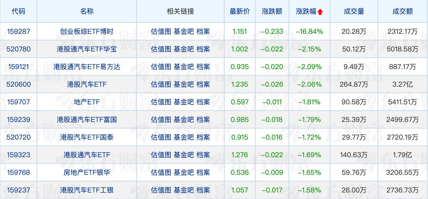 下跌方面,创业板综ETF博时领跌16.84%,港股汽车相关ETF集体回调。