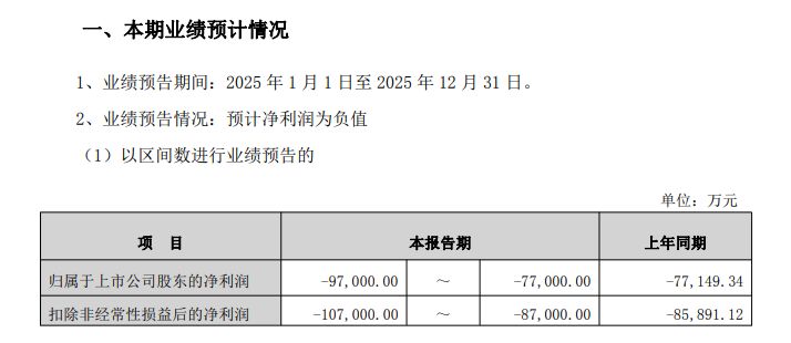 截至2025年三季度末,仕净科技货币资金为3.03亿元,而上年同期期末为7.29亿元。1月30日,仕净科技披露2025年业绩预告,报告期内归母净利润预计为-9.7亿元至-7.7亿元,与上年同期的-7.71亿元相比,亏损区间略有扩大。公司解释业绩出现亏损原因时表示,2025年,光伏产业链产品价格持续处于低位,公司电池片产品售价被迫下调,而固定成本未能同步压降,导致毛利水平大幅回落,企业经营盈利压力加剧,全年出现亏损。