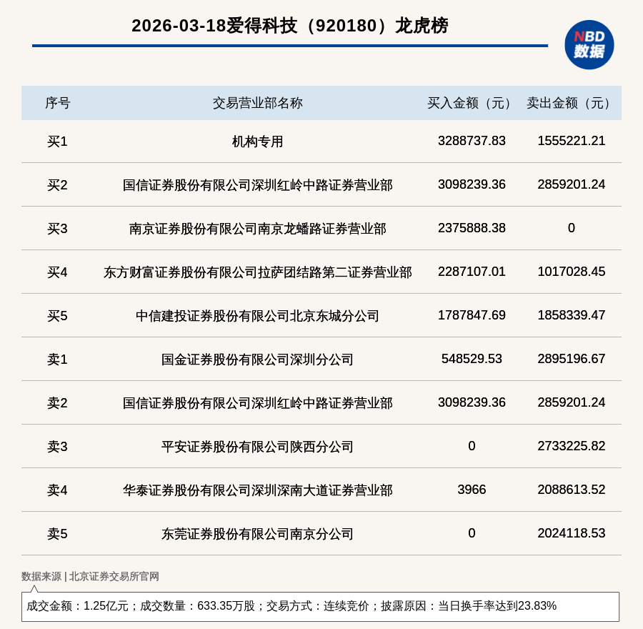 每经讯,2026年3月18日,北交所上市公司爱得科技(920180,收盘价:19.93元)登上龙虎榜,交易方式是连续竞价,披露原因是当日换手率达到23.83%,成交数量633.35万股,成交金额1.25亿元。买一席位为机构专用,买入328.87万元;卖一席位为国金证券股份有限公司深圳分公司,卖出289.52万元。