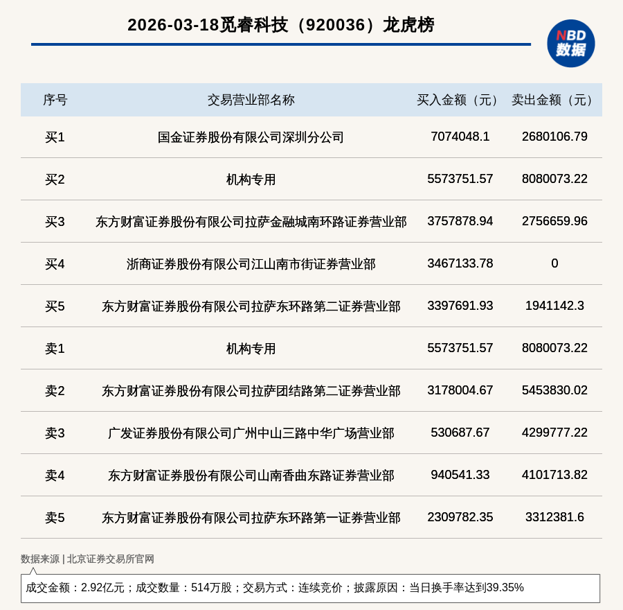 每经讯,2026年3月18日,北交所上市公司觅睿科技(920036,收盘价:58.32元)登上龙虎榜,交易方式是连续竞价,披露原因是当日换手率达到39.35%,成交数量514万股,成交金额2.92亿元。买一席位为国金证券股份有限公司深圳分公司,买入707.4万元;卖一席位为机构专用,卖出808.01万元。