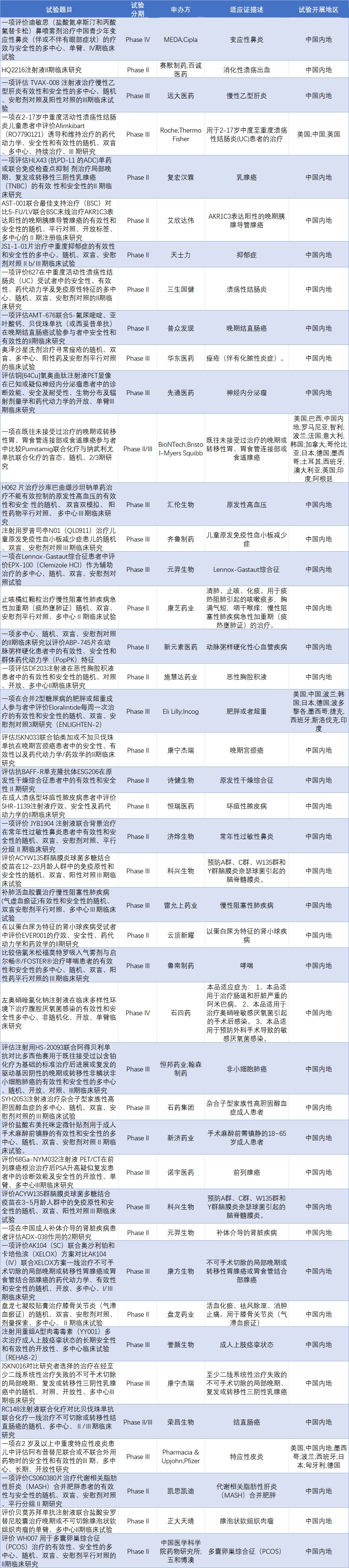 根据医药魔方提供的数据,3月9日至3月13日,国家药品监督管理局药品审评中心共披露122条临床试验登记信息,其中43条为处于临床试验II期及以上的创新药新登记临床试验信息,所有临床研究项目尚未启动患者招募。