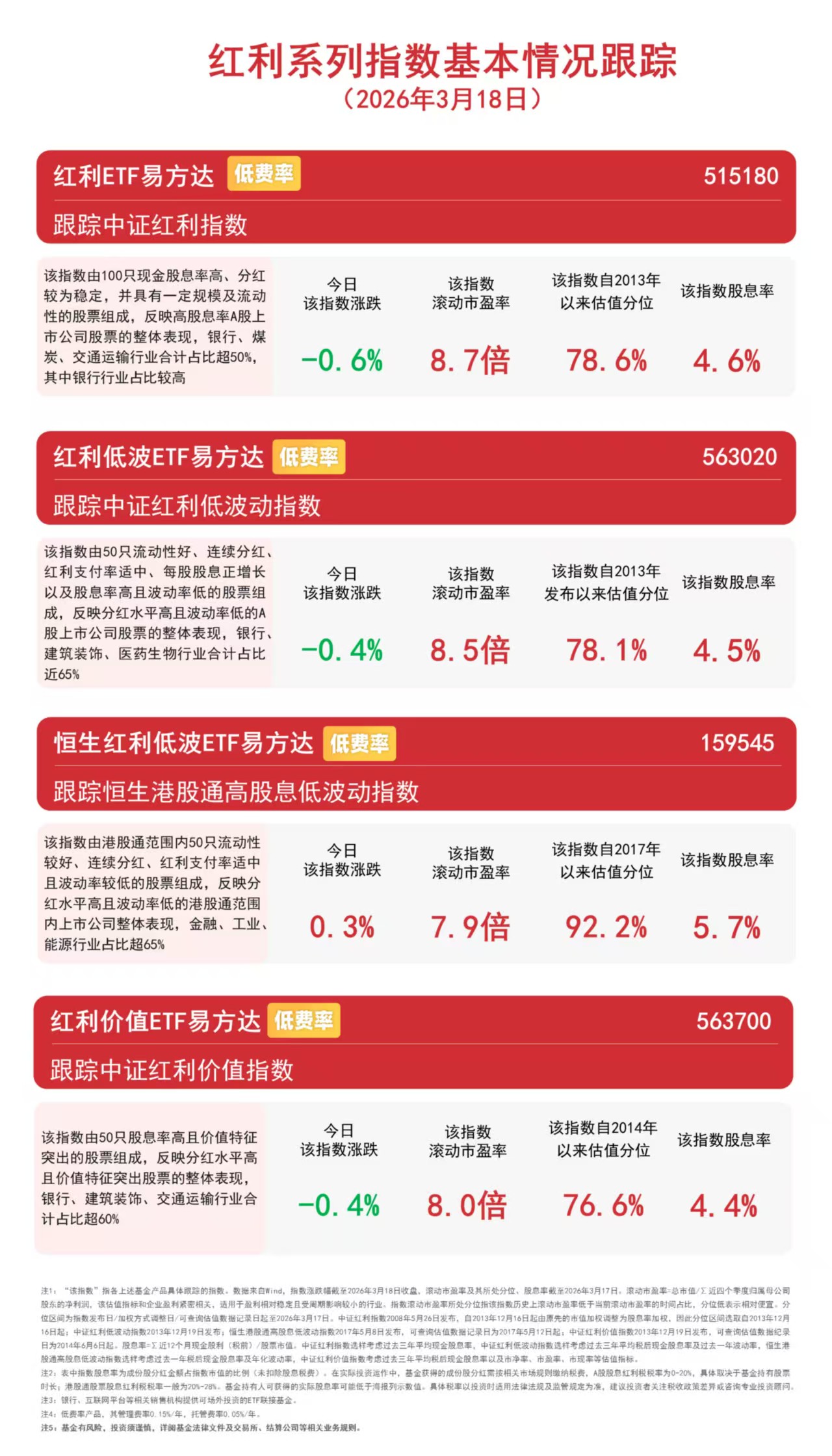 据悉,易方达基金是目前唯一一家红利类ETF全部实行0.15%/年管理费率的基金公司,可助力投资者低成本布局高股息资产。