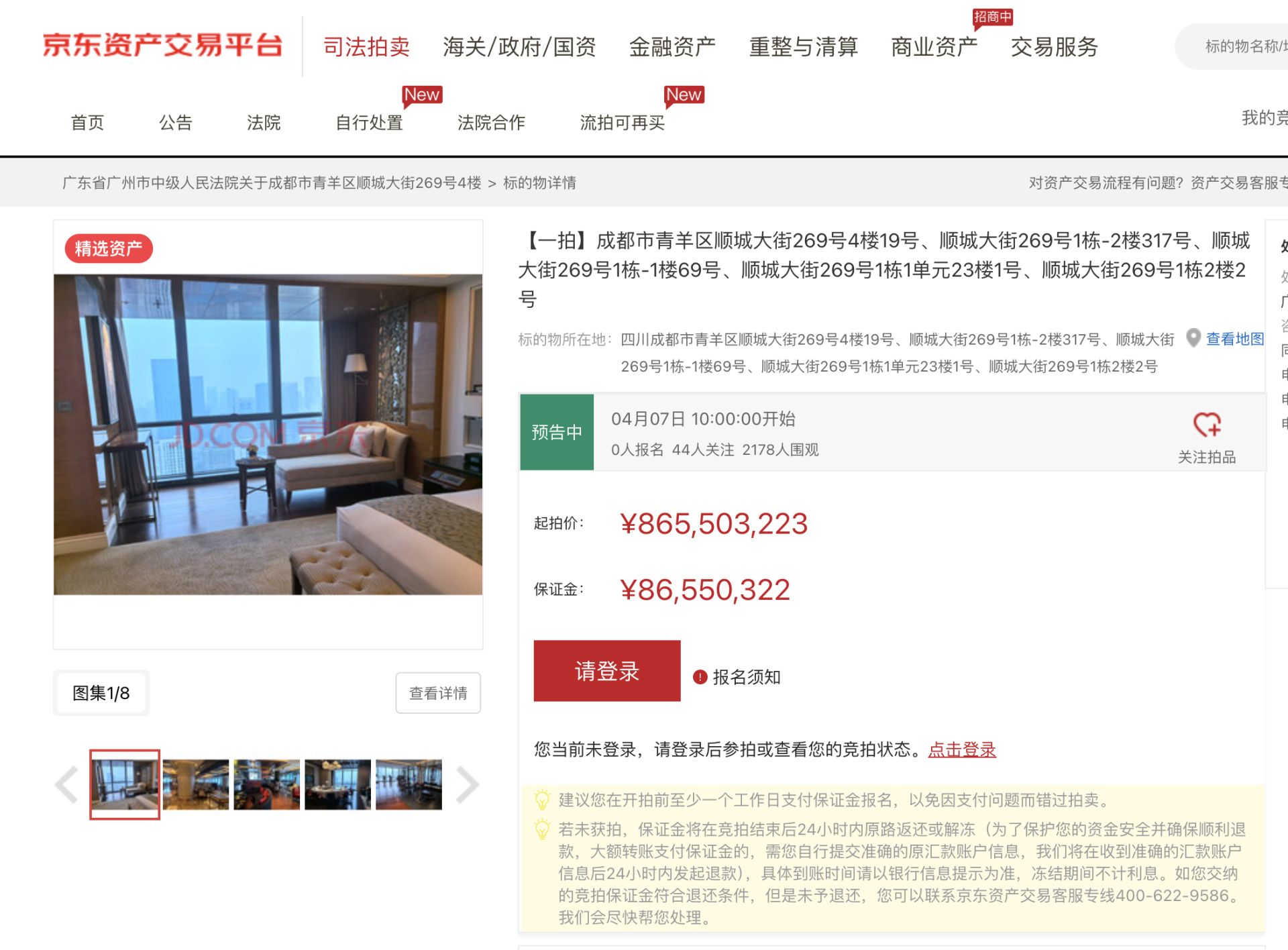 日前,京东资产交易平台显示,广东省广州市中级人民法院已发布司法拍卖公告,计划于2026年4月7日10时至4月8日10时,对成都富力丽思卡尔顿酒店的相关房产进行公开拍卖。标的物起拍价约8.65亿元,竞买保证金为8655.0322万元。截至3月18日22时,该拍卖已吸引2171人次围观、43人关注,但尚无人报名参与。
