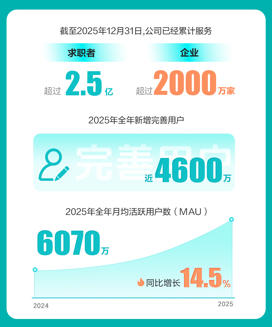 截至2025年12月31日止的十二个月内,公司付费企业客户数达到680万,同比上涨11.5%。截至2025年12月31日,公司累计服务超过2.5亿求职者,服务企业总数超过2000万家。