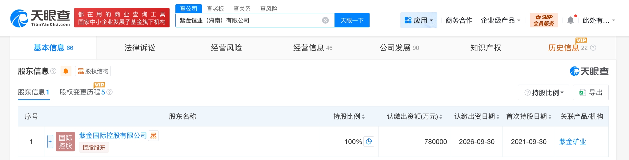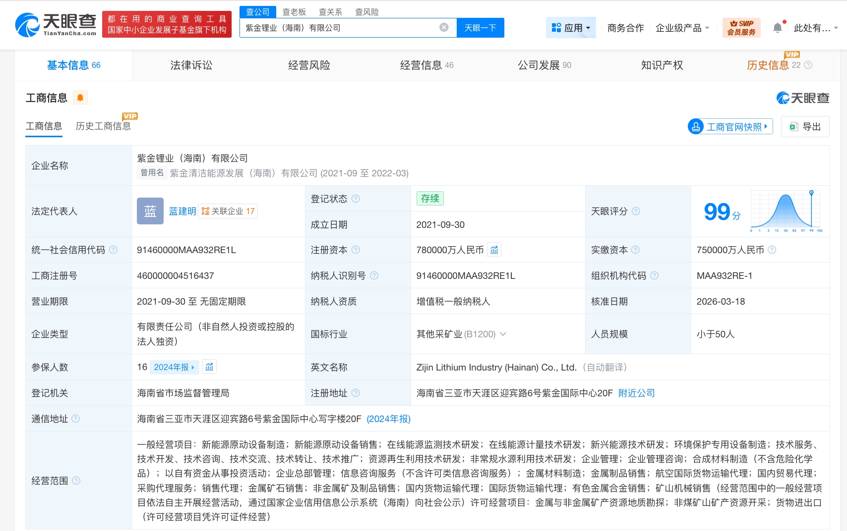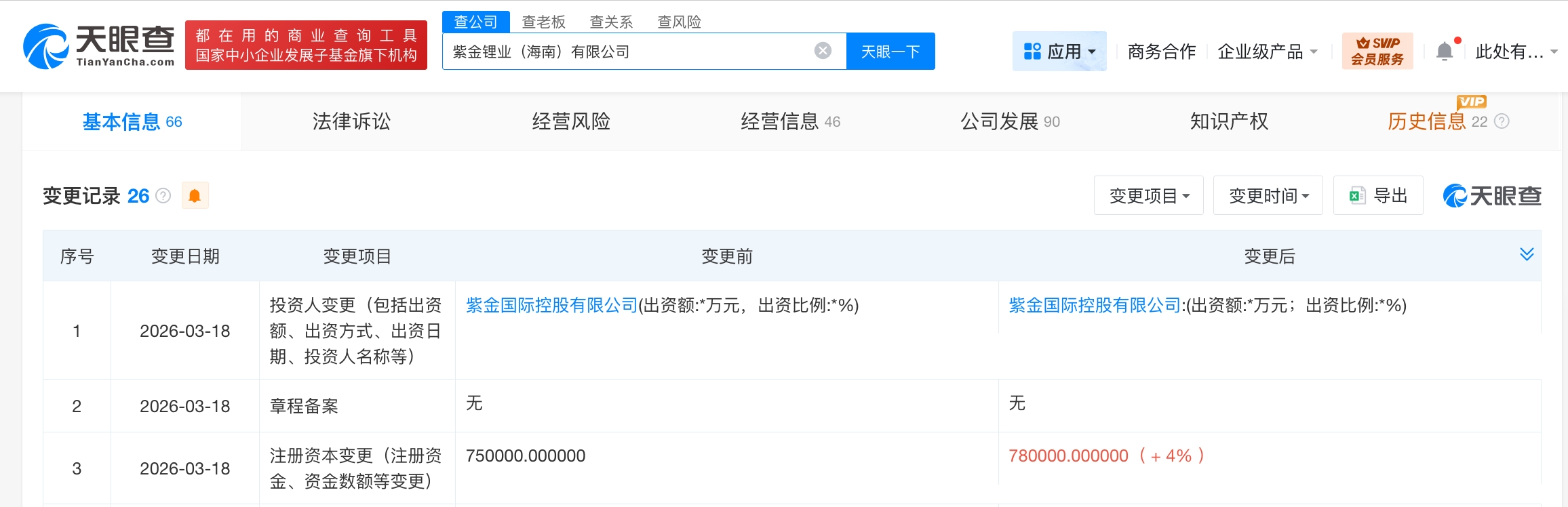 每经AI快讯,天眼查App显示,近日,紫金锂业(海南)有限公司发生工商变更,注册资本由75亿元人民币增至78亿元人民币。该公司成立于2021年9月,法定代表人为蓝建明,经营范围含新能源原动设备制造、新能源原动设备销售、在线能源监测技术研发、在线能源计量技术研发、新兴能源技术研发、环境保护专用设备制造等。股东信息显示,该公司由紫金矿业(601899)旗下紫金国际控股有限公司全资持股。