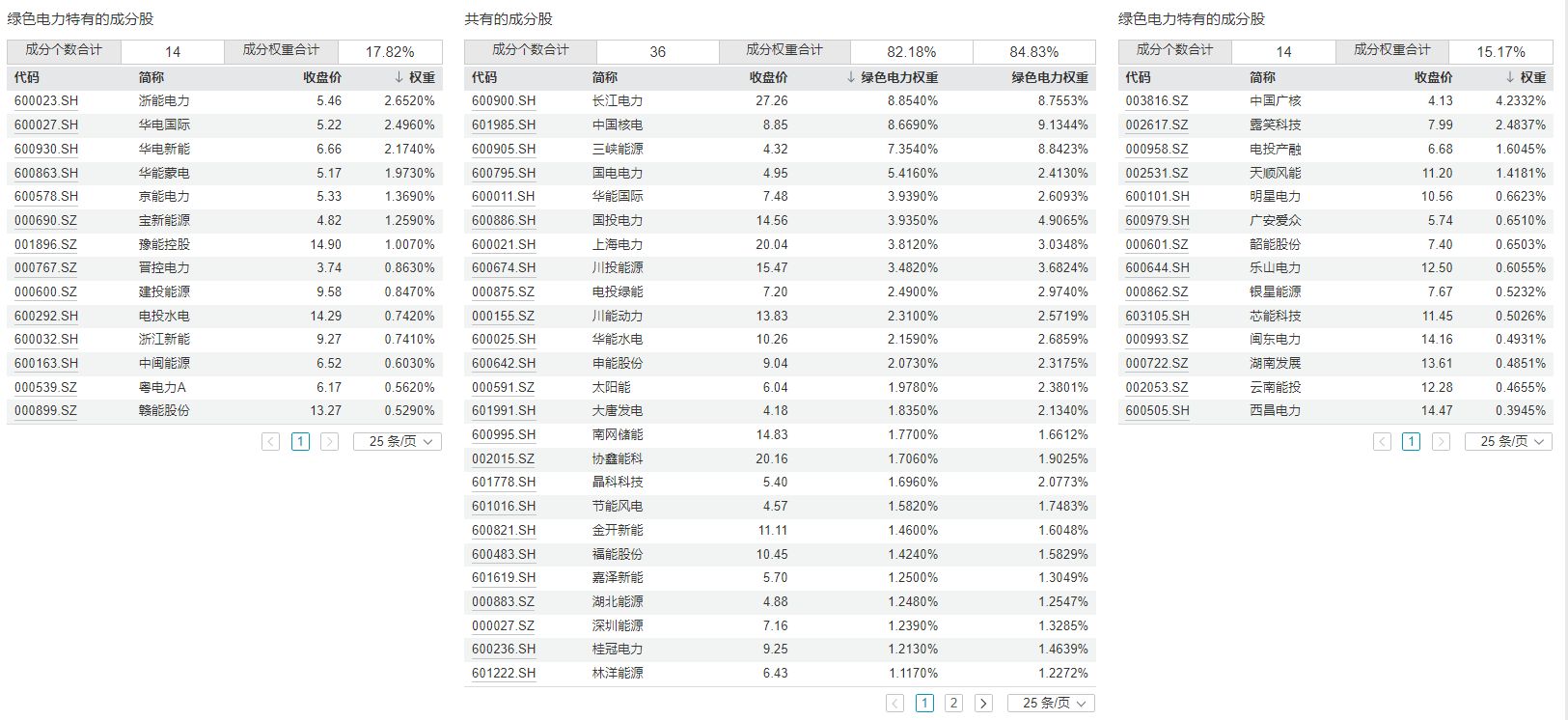 进一步对比两个指数的成分股,可以发现两个指数重合的成分股数量是36只,各自独有的成分股数量都是14只,中证绿色电力指数独有的成分股主要包括了浙能电力、华电国际、华电新能等,国证绿色电力指数独有的成分股主要包括了中国广核、露笑科技、电投产融等。