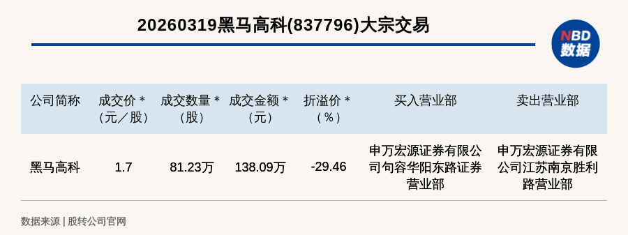 每经讯,2026年3月19日,新三板创新层公司黑马高科(837796,收盘价:2.41元)发生一笔大宗交易,成交价1.7元/股,成交数量81.23万股,成交金额138.09万元,折价29.46%。买入营业部是申万宏源证券有限公司句容华阳东路证券营业部,卖出营业部是申万宏源证券有限公司江苏南京胜利路营业部。