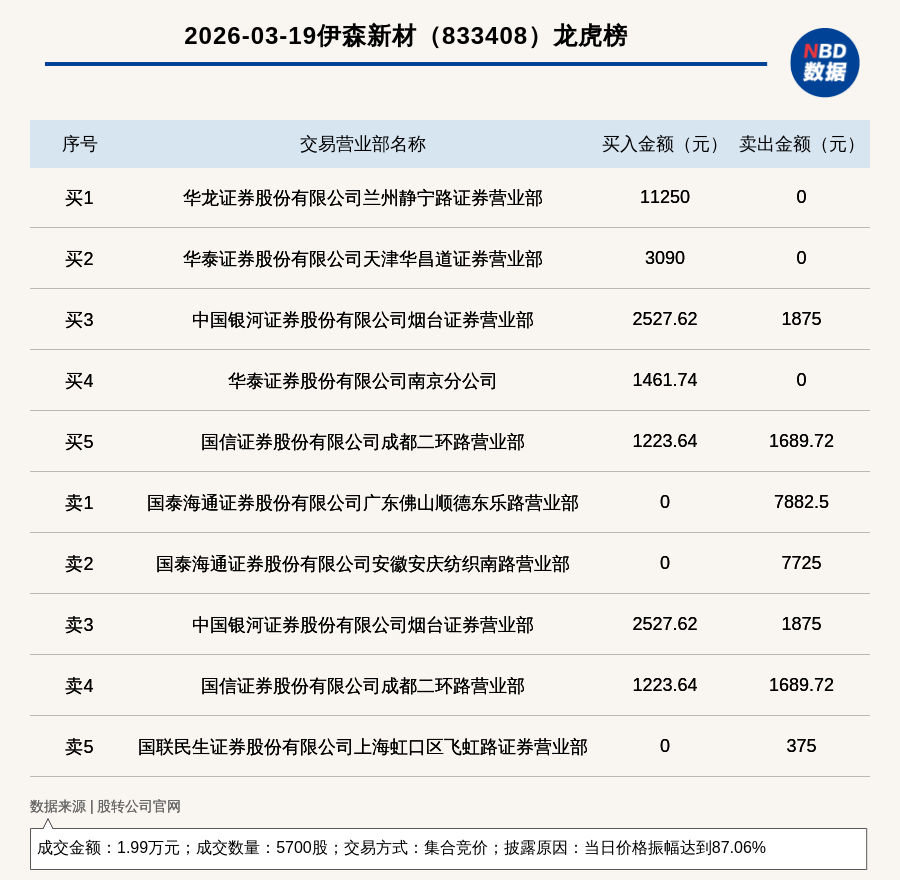 每经讯,2026年3月19日,新三板创新层公司伊森新材(833408,收盘价:3.09元)登上龙虎榜,交易方式是集合竞价,披露原因是当日价格振幅达到87.06%,成交数量5700股,成交金额1.99万元。买一席位为华龙证券股份有限公司兰州静宁路证券营业部,买入1.12万元;卖一席位为国泰海通证券股份有限公司广东佛山顺德东乐路营业部,卖出7882.5元。
