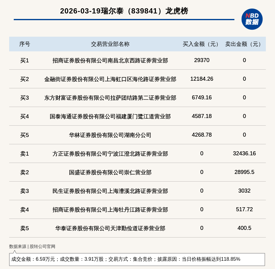 每经讯,2026年3月19日,新三板创新层公司瑞尔泰(839841,收盘价:1.22元)登上龙虎榜,交易方式是集合竞价,披露原因是当日价格振幅达到118.85%,成交数量3.91万股,成交金额6.59万元。买一席位为招商证券股份有限公司南昌北京西路证券营业部,买入2.94万元;卖一席位为方正证券股份有限公司宁波江澄北路证券营业部,卖出3.24万元。