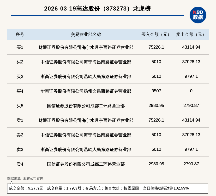每经讯,2026年3月19日,新三板创新层公司高达股份(873273,收盘价:7.98元)登上龙虎榜,交易方式是集合竞价,披露原因是当日价格振幅达到102.99%,成交数量1.79万股,成交金额9.27万元。买一席位为财通证券股份有限公司海宁水月亭西路证券营业部,买入7.52万元;卖一席位为财通证券股份有限公司海宁水月亭西路证券营业部,卖出4.31万元。