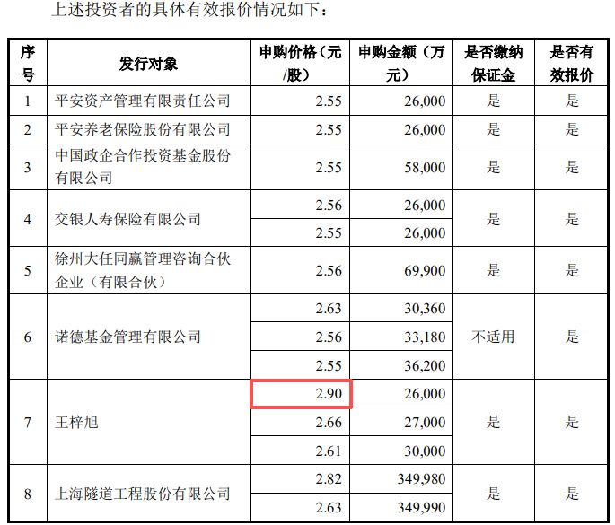 据中国能建公告,王梓旭曾给出了2.9元/股的最高申购价,显著高于其他绝大多数发行对象的申购价格。除了此次斥资约3亿元认购中国能建定增外,记者注意到,王梓旭此前还参与认购了宏和科技非公开发行的124.97万股股票,认购价格为40.01元/股,认购总价近5000万元。