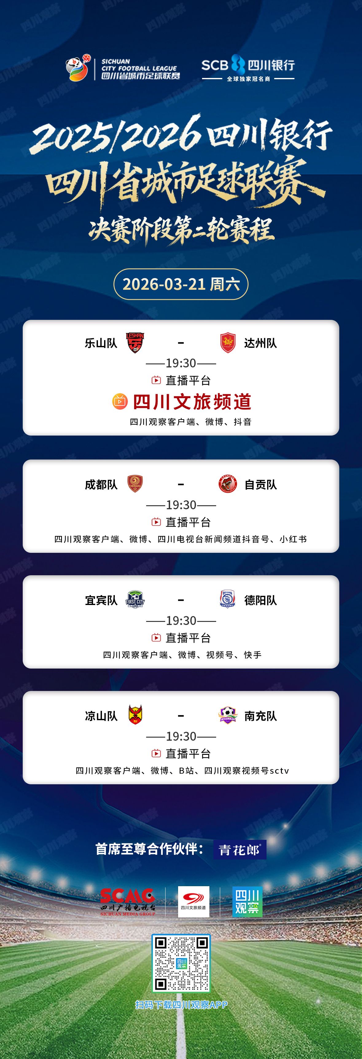 2025/2026四川银行四川省城市足球联赛(简称“川超”)决赛阶段第二轮四场对决将于3月21日(周六)进行。