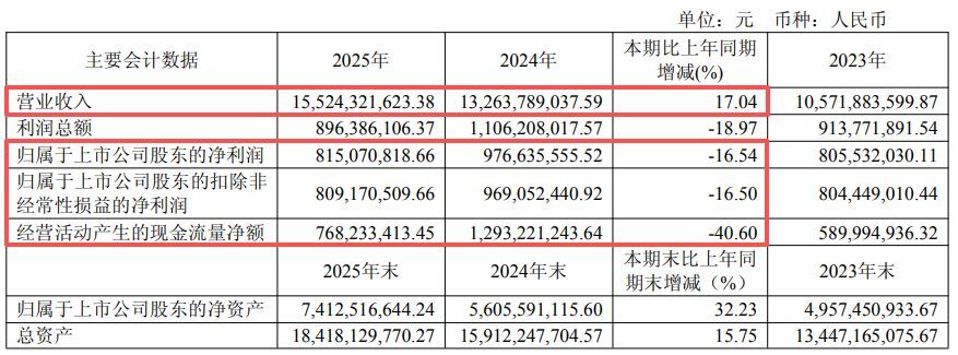 3月19日晚间,新泉股份(SH603179,股价69.53元,市值354.7亿元)披露2025年年报,公司2025年实现营收155.24亿元,同比增长17.04%;实现归母净利润8.15亿元,同比下滑16.54%;实现扣非净利润8.09亿元,同比下滑16.5%;基本每股收益1.66元,同比下滑17%。公司向全体股东每10股派发现金股利3元(含税),剩余未分配利润结转以后年度,以资本公积金转增股本,每10股转增4股,不送红股。