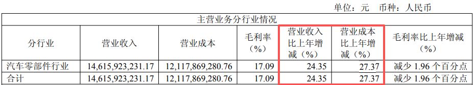尽管在报告期内取得诸多成绩,但新泉股份最终仍交出了一份“增收不增利”的答卷。除了归母净利润和扣非净利润均录得下滑外,受行业竞争、降价压力等因素影响,新泉股份2025年主营业务(汽车零部件)毛利率比上年同期减少了1.96个百分点至17.09%。