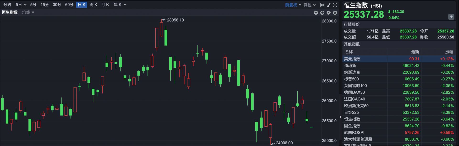 截至发稿,恒生指数开盘报25337.28点,下跌163.30点,跌幅0.64%。