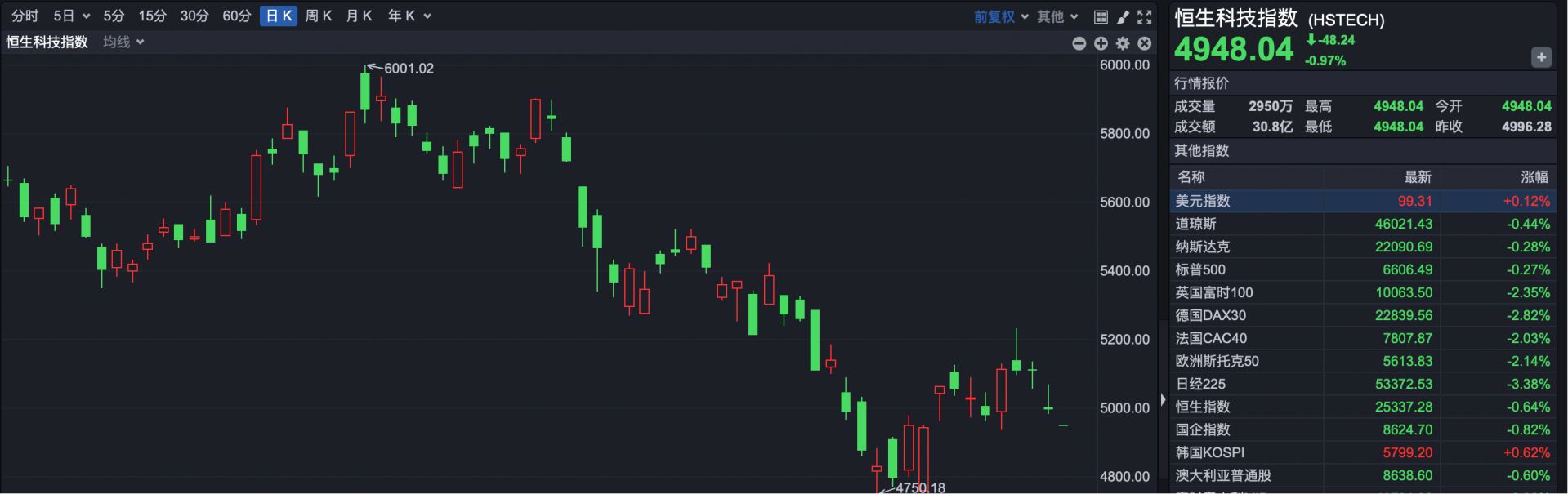 恒生科技指数开盘报4948.04点,下跌48.24点,跌幅0.97%。