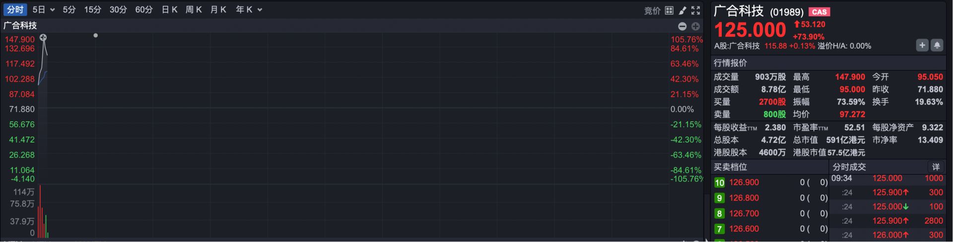 新股方面,上市首日入通的广合科技(HK01989)高开超32%,随后股价大幅拉升,截至发稿,最大涨幅超过100%。