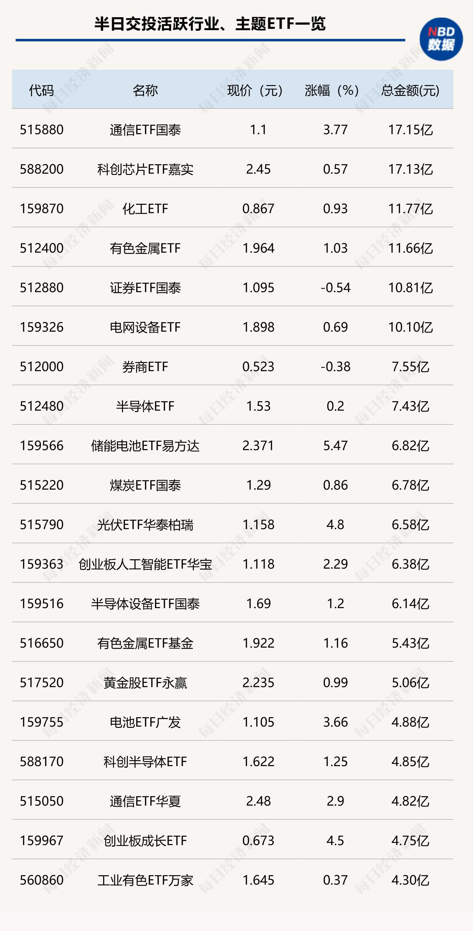 今日上午,通信ETF国泰(515880)交投活跃,半日成交金额达到17.15亿元。另外,科创芯片ETF嘉实(588200)、化工ETF(159870)、有色金属ETF(512400)等5只ETF半日成交金额也超过10亿元;跨境ETF方面, 标普油气ETF嘉实(159518)今日放量大涨,半日成交金额高达67.05亿元。