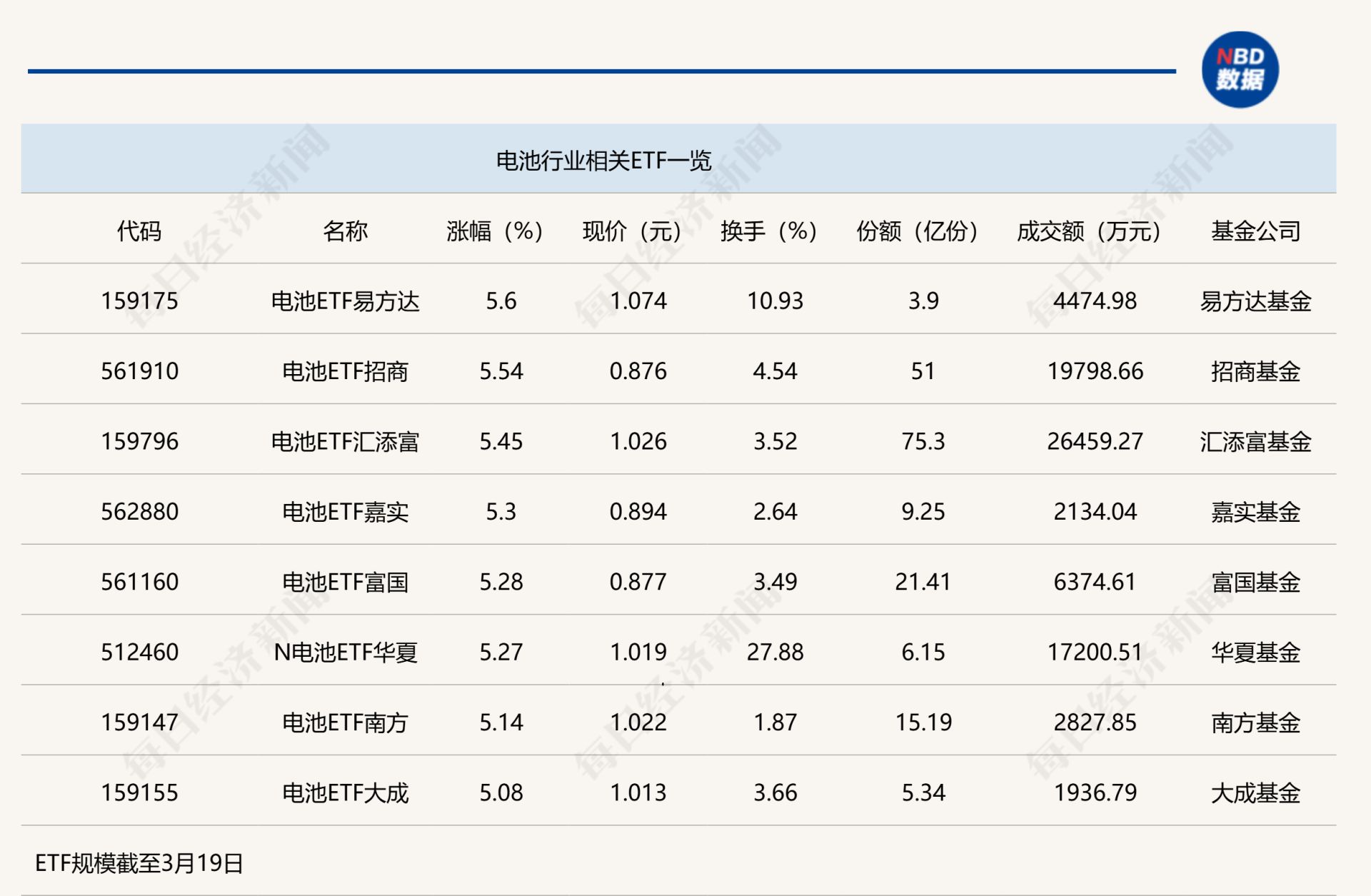 点评:电池ETF易方达(159175)和电池ETF(561910)招商今日上午分别上涨5.6%和5.54%,其中,电池ETF(561910)招商规模相对较大,其份额为51亿份,成交金额为1.98亿元,上述两只ETF追踪的是中证电池主题指数,追踪该指数的ETF还包括锂电池ETF富国(561160)、电池ETF汇添富(159796)等。