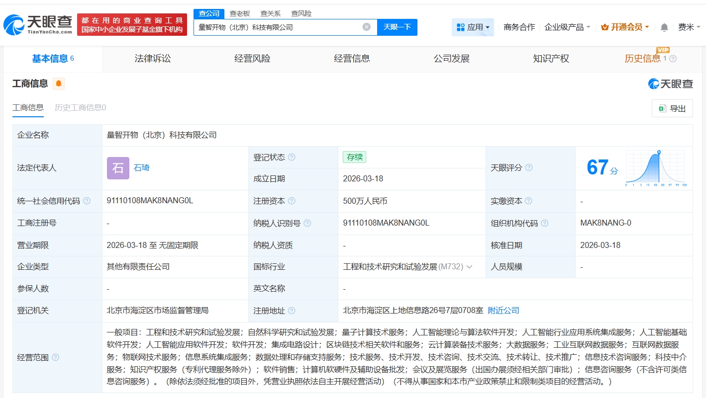 每经AI快讯,天眼查App显示,近日,量智开物(北京)科技有限公司成立,法定代表人为石琦,注册资本500万元人民币,经营范围含量子计算技术服务、人工智能理论与算法软件开发、人工智能行业应用系统集成服务等。股东信息显示,该公司由两仪万象(北京)科技有限公司、科大讯飞(北京)有限公司、安徽言知科技有限公司、量智臻融(北京)科技合伙企业(有限合伙)共同持股。
