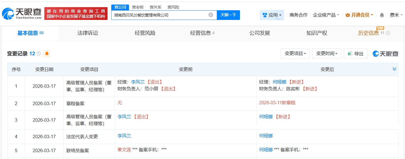 每经AI快讯,天眼查App显示,近日,湖南西贝凤兰餐饮管理有限公司发生工商变更,李凤兰卸任法定代表人、经理、执行董事,何娅娜接任法定代表人、经理并担任执行公司事务的董事。湖南西贝凤兰餐饮管理有限公司成立于2018年10月,注册资本500万元人民币,经营范围包括餐饮管理、餐饮服务、食品销售等。股东信息显示,该公司由内蒙古西贝餐饮集团有限公司、北京部落餐饮管理合伙企业(有限合伙)共同持股。
