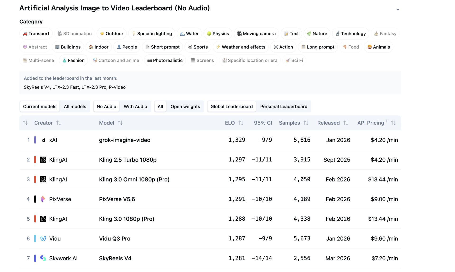 根据全球知名的独立AI基准测试与分析平台Artificial Analysis.ai 2026年2月的最新排名,在全球图生视频(无音频)赛道排行榜中,爱诗科技旗下PixVerse V5.6凭借1291的ELO(一种用于衡量AI模型之间相对能力的动态排名机制)综合质量评分(通过盲测对战得出)位列第四,仅次于马斯克旗下xAI的grok-imagine-video、快手旗下可灵(Kling AI)的Kling 2.5 Turbo 1080p与Kling 3.0 Omni 1080p(Pro)。