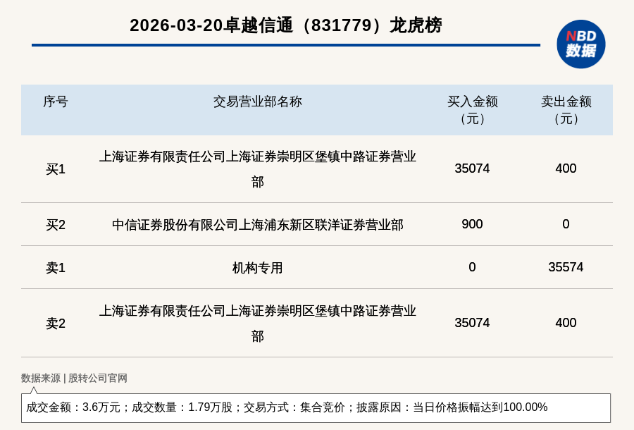 每经讯,2026年3月20日,新三板创新层公司卓越信通(831779,收盘价:4元)登上龙虎榜,交易方式是集合竞价,披露原因是当日价格振幅达到100.00%,成交数量1.79万股,成交金额3.6万元。买一席位为上海证券有限责任公司上海证券崇明区堡镇中路证券营业部,买入3.51万元;卖一席位为机构专用,卖出3.56万元。