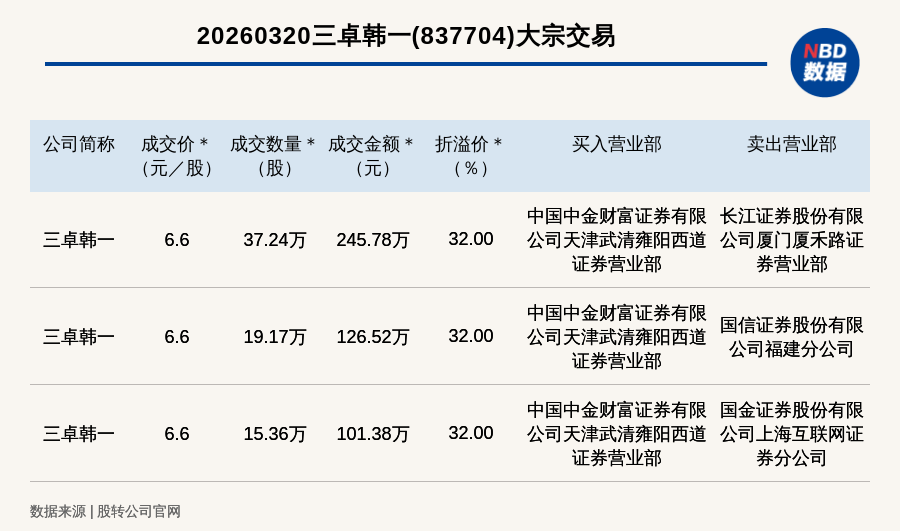 每经讯,2026年3月20日,新三板创新层公司三卓韩一(837704,收盘价:5元)发生3笔大宗交易,总成交金额为473.68万元,成交金额最高的一笔成交价6.6元/股,成交数量37.24万股,成交金额245.78万元,溢价32%。买入营业部是中国中金财富证券有限公司天津武清雍阳西道证券营业部,卖出营业部是长江证券股份有限公司厦门厦禾路证券营业部。