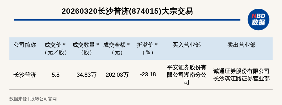 每经讯,2026年3月20日,新三板创新层公司长沙普济(874015,收盘价:7.55元)发生一笔大宗交易,成交价5.8元/股,成交数量34.83万股,成交金额202.03万元,折价23.18%。买入营业部是平安证券股份有限公司湖南分公司,卖出营业部是诚通证券股份有限公司长沙滨江路证券营业部。
