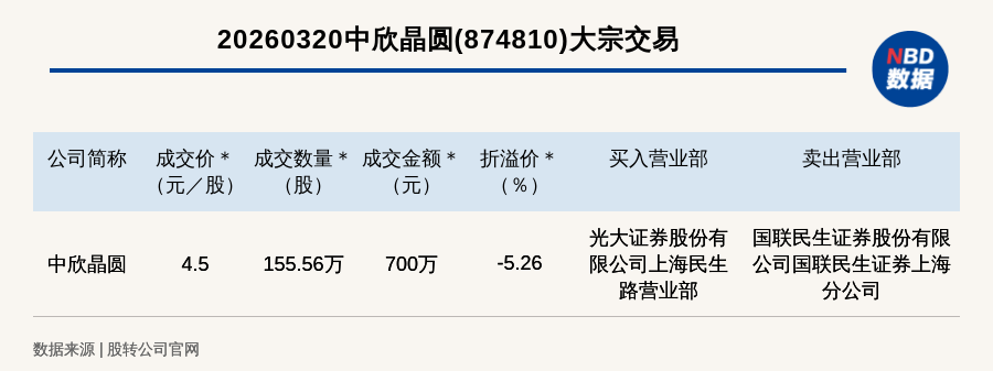 每经讯,2026年3月20日,新三板创新层公司中欣晶圆(874810,收盘价:4.75元)发生一笔大宗交易,成交价4.5元/股,成交数量155.56万股,成交金额700万元,折价5.26%。买入营业部是光大证券股份有限公司上海民生路营业部,卖出营业部是国联民生证券股份有限公司国联民生证券上海分公司。