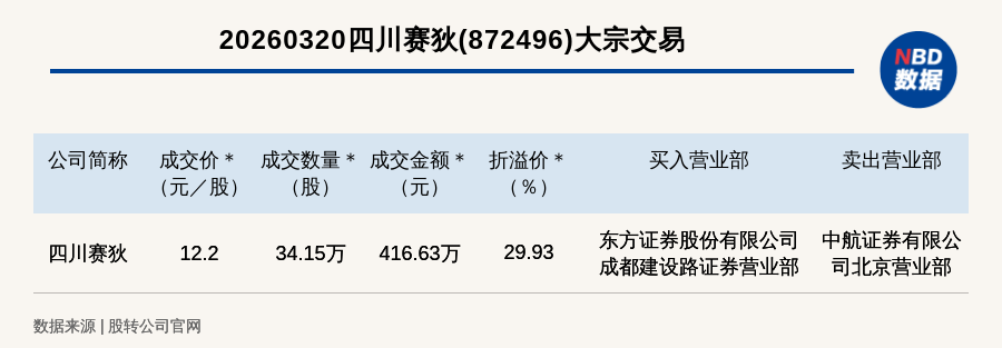 每经讯,2026年3月20日,新三板创新层公司四川赛狄(872496,收盘价:9.39元)发生一笔大宗交易,成交价12.2元/股,成交数量34.15万股,成交金额416.63万元,溢价29.93%。买入营业部是东方证券股份有限公司成都建设路证券营业部,卖出营业部是中航证券有限公司北京营业部。