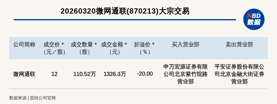 每经讯,2026年3月20日,新三板基础层公司微网通联(870213,收盘价:15元)发生一笔大宗交易,成交价12元/股,成交数量110.52万股,成交金额1326.3万元,折价20%。买入营业部是申万宏源证券有限公司北京紫竹院路营业部,卖出营业部是平安证券股份有限公司北京金融大街证券营业部。