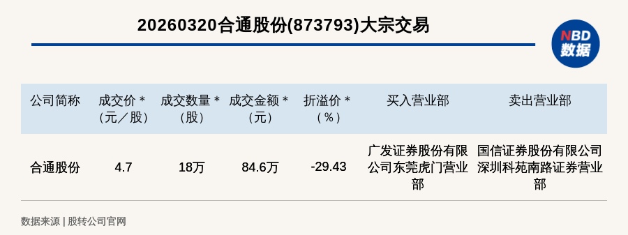 每经讯,2026年3月20日,新三板基础层公司合通股份(873793,收盘价:6.66元)发生一笔大宗交易,成交价4.7元/股,成交数量18万股,成交金额84.6万元,折价29.43%。买入营业部是广发证券股份有限公司东莞虎门营业部,卖出营业部是国信证券股份有限公司深圳科苑南路证券营业部。