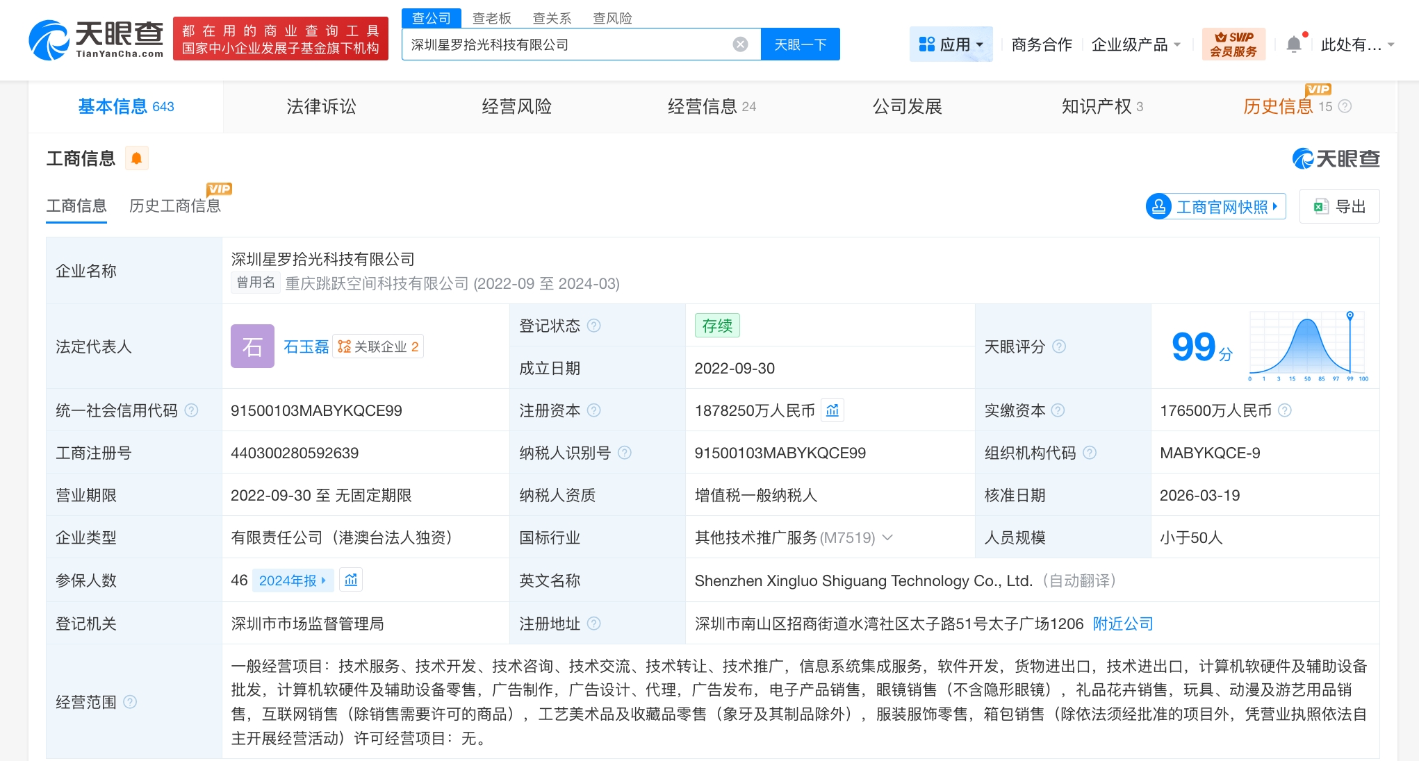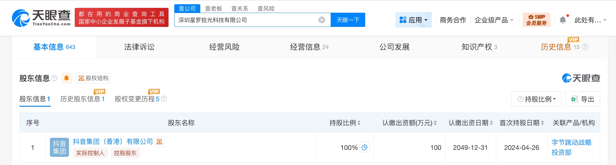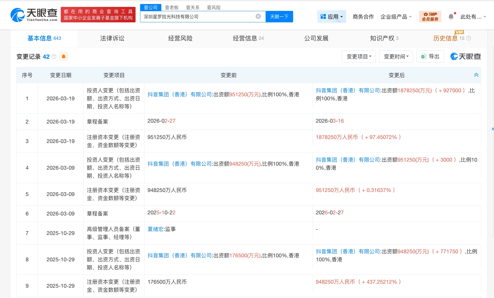 每经AI快讯,天眼查工商信息显示,近日,深圳星罗拾光科技有限公司发生工商变更,注册资本由约95.1亿元人民币增至约187.8亿元人民币,增幅约97%。该公司成立于2022年9月,法定代表人为石玉磊,经营范围包括技术服务、技术开发、技术咨询、技术交流、技术转让、技术推广,信息系统集成服务等。股东信息显示,该公司由抖音集团(香港)有限公司全资持股。