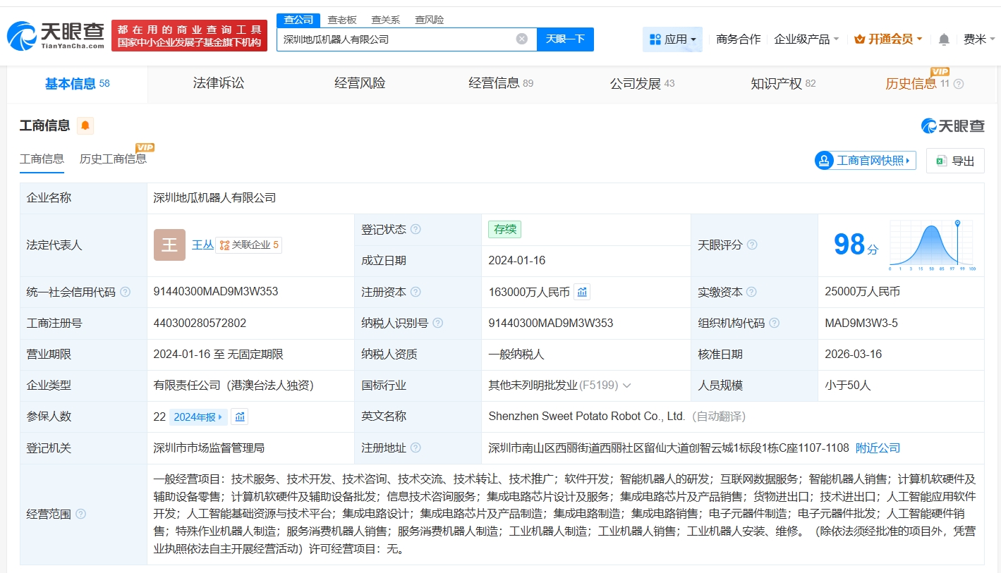每经AI快讯,天眼查App显示,近日,深圳地瓜机器人有限公司发生工商变更,注册资本由6.3亿元人民币增至16.3亿元人民币,增幅约159%。深圳地瓜机器人有限公司成立于2024年1月,法定代表人为王丛,经营范围包括智能机器人的研发、集成电路芯片设计及服务、人工智能应用软件开发等。股东信息显示,该公司由D-RoboticsHoldingLimited全资持股。