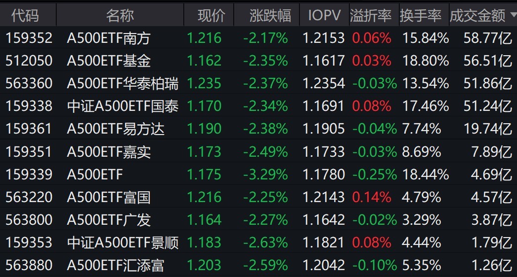 截至上午收盘,场内跟踪中证A500指数的ETF跌超2%。其中,有11只中证A500相关ETF成交额超1亿元,2只超56亿元。A500ETF南方、A500ETF基金早盘成交额分别为58.77亿元、56.51亿元。