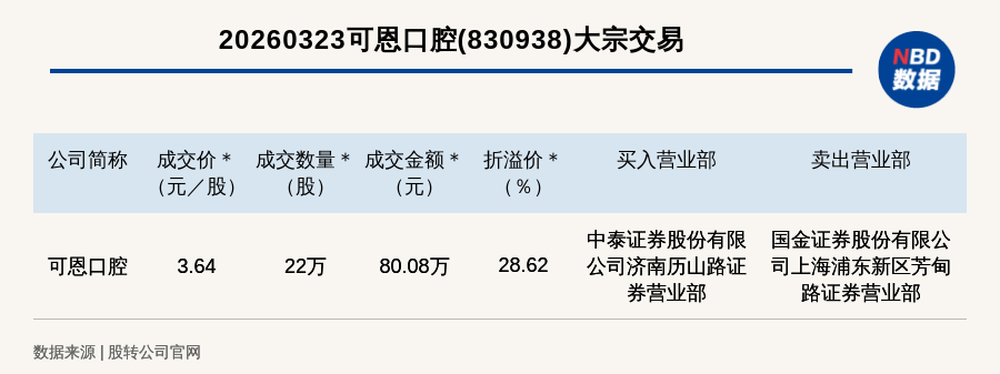 每经讯,2026年3月23日,新三板创新层公司可恩口腔(830938,收盘价:2.83元)发生一笔大宗交易,成交价3.64元/股,成交数量22万股,成交金额80.08万元,溢价28.62%。买入营业部是中泰证券股份有限公司济南历山路证券营业部,卖出营业部是国金证券股份有限公司上海浦东新区芳甸路证券营业部。