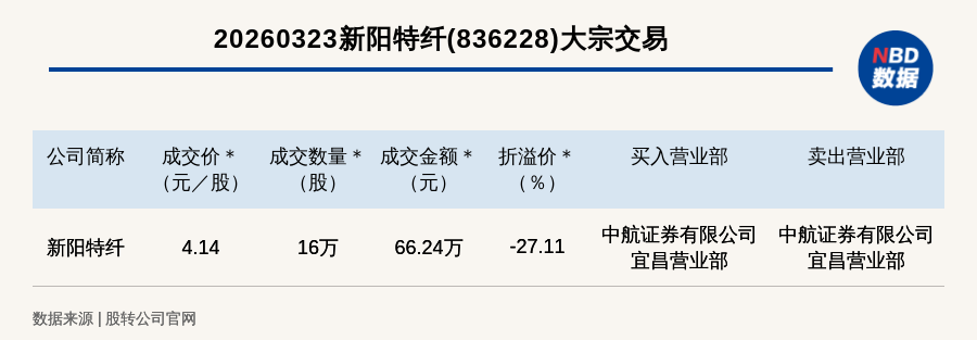 每经讯,2026年3月23日,新三板创新层公司新阳特纤(836228,收盘价:5.68元)发生一笔大宗交易,成交价4.14元/股,成交数量16万股,成交金额66.24万元,折价27.11%。买入营业部是中航证券有限公司宜昌营业部,卖出营业部是中航证券有限公司宜昌营业部。