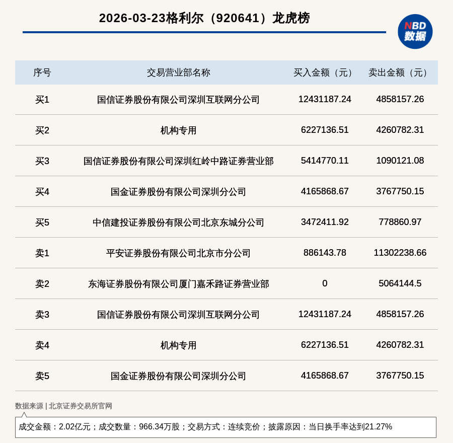 每经讯,2026年3月23日,北交所上市公司格利尔(920641,收盘价:20.9元)登上龙虎榜,交易方式是连续竞价,披露原因是当日换手率达到21.27%,成交数量966.34万股,成交金额2.02亿元。买一席位为国信证券股份有限公司深圳互联网分公司,买入1243.12万元;卖一席位为平安证券股份有限公司北京市分公司,卖出1130.22万元。