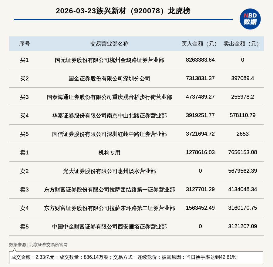 每经讯,2026年3月23日,北交所上市公司族兴新材(920078,收盘价:26.02元)登上龙虎榜,交易方式是连续竞价,披露原因是当日换手率达到42.81%,成交数量886.14万股,成交金额2.33亿元。买一席位为国元证券股份有限公司杭州金鸡路证券营业部,买入826.34万元;卖一席位为机构专用,卖出765.62万元。
