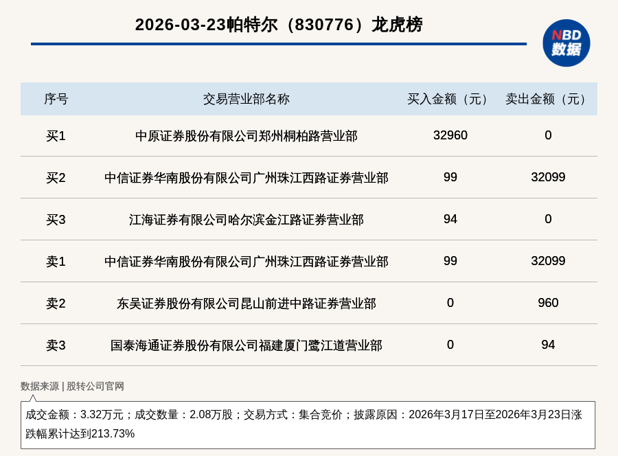 每经讯,2026年3月23日,新三板基础层公司帕特尔(830776,收盘价:1.6元)登上龙虎榜,交易方式是集合竞价,披露原因是2026年3月17日至2026年3月23日涨跌幅累计达到213.73%,成交数量2.08万股,成交金额3.32万元。买一席位为中原证券股份有限公司郑州桐柏路营业部,买入3.3万元;卖一席位为中信证券华南股份有限公司广州珠江西路证券营业部,卖出3.21万元。