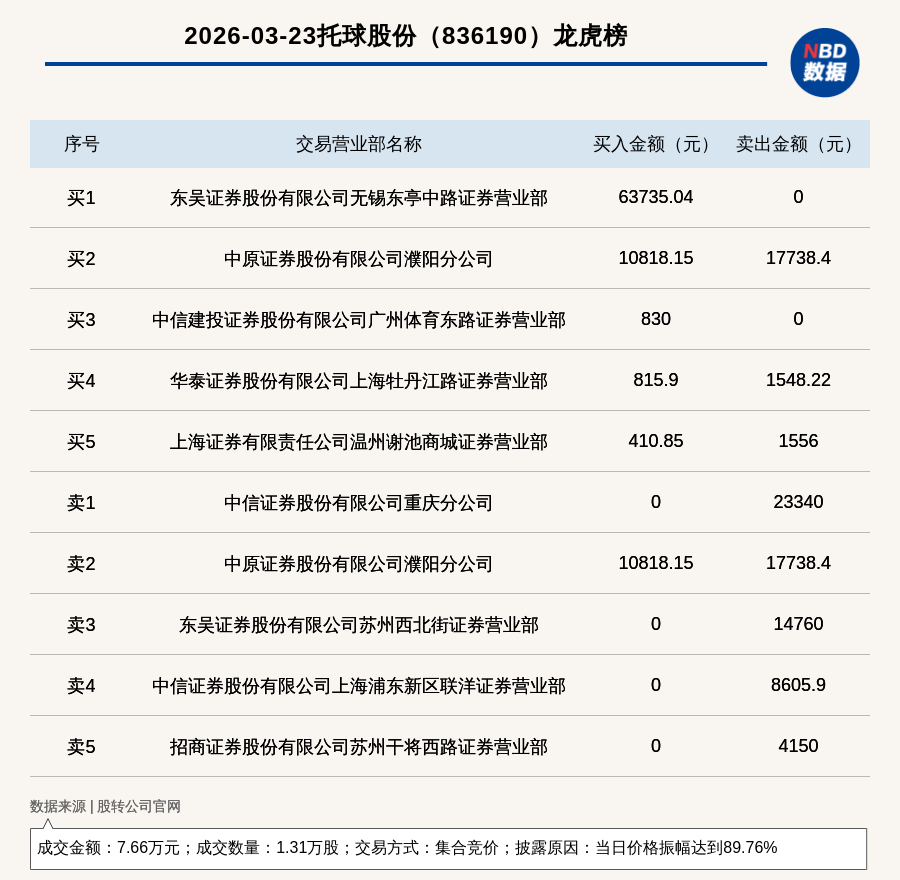 每经讯,2026年3月23日,新三板创新层公司托球股份(836190,收盘价:4.15元)登上龙虎榜,交易方式是集合竞价,披露原因是当日价格振幅达到89.76%,成交数量1.31万股,成交金额7.66万元。买一席位为东吴证券股份有限公司无锡东亭中路证券营业部,买入6.37万元;卖一席位为中信证券股份有限公司重庆分公司,卖出2.33万元。