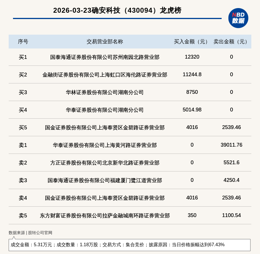 每经讯,2026年3月23日,新三板创新层公司确安科技(430094,收盘价:5.86元)登上龙虎榜,交易方式是集合竞价,披露原因是当日价格振幅达到67.43%,成交数量1.18万股,成交金额5.31万元。买一席位为国泰海通证券股份有限公司苏州南园北路营业部,买入1.23万元;卖一席位为华泰证券股份有限公司上海黄河路证券营业部,卖出3.9万元。
