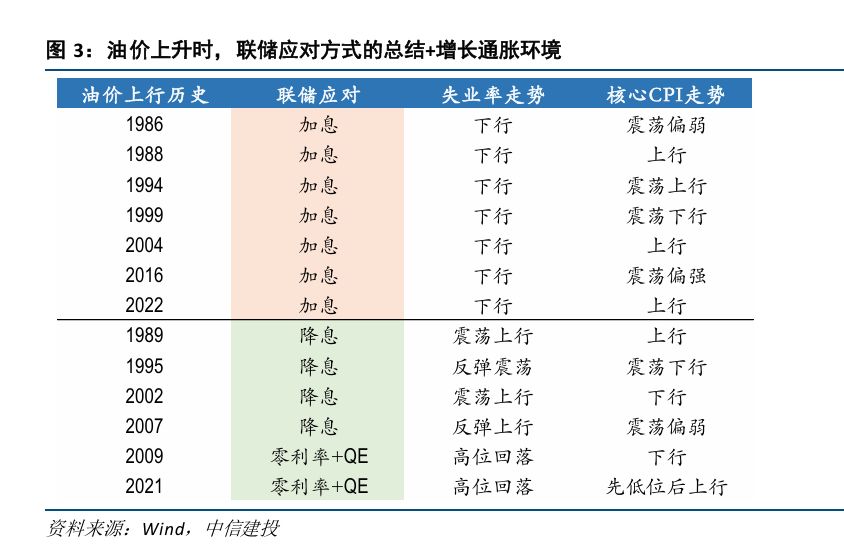 中信建投证券在3月22日的研报中指出,历史上油价上行时,美联储加息和降息(宽松)的占比基本接近。这说明油价并不是决定货币政策的核心变量。因为,油价对通胀可能产生方向上不一致的影响:通胀有上行风险,消费有负面压制,需要看哪个矛盾占据主导。