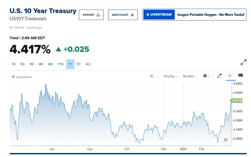 3月23日,美国10年期国债收益率在亚洲交易时段一度升至4.423%,创2025年7月以来新高,现报4.417%。