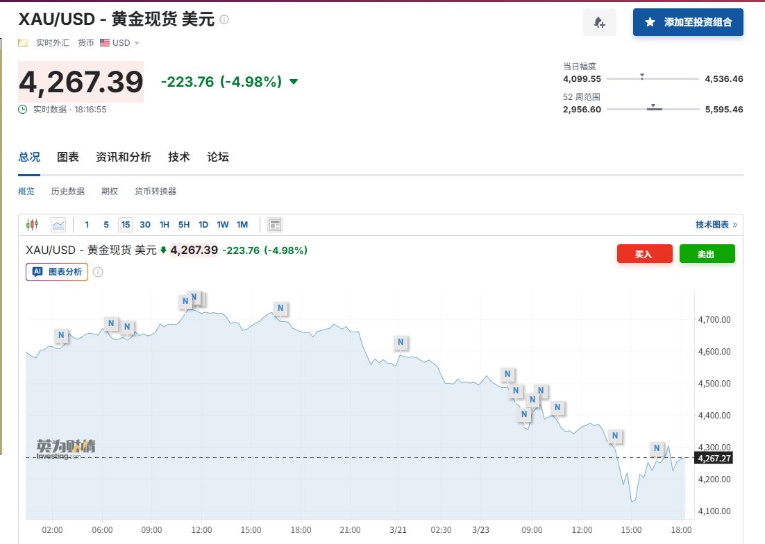 3月23日,继上周重挫超10%后,伦敦现货黄金盘中接连失守4500、4400、4300、4200、4100美元/盎司五个整数关口,最低触及每盎司4098美元,日内跌超8.7%。截至发稿,现货黄金报4267.39美元/盎司,跌幅仍近5%。被视为避风港的美债、欧债近期也遭遇抛售,收益率攀升。