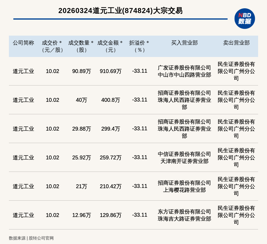 每经讯,2026年3月24日,新三板基础层公司道元工业(874824,收盘价:14.98元)发生6笔大宗交易,总成交金额为2210.88万元,成交金额最高的一笔成交价10.02元/股,成交数量90.89万股,成交金额910.69万元,折价33.11%。买入营业部是广发证券股份有限公司中山市中山四路营业部,卖出营业部是民生证券股份有限公司广州分公司。