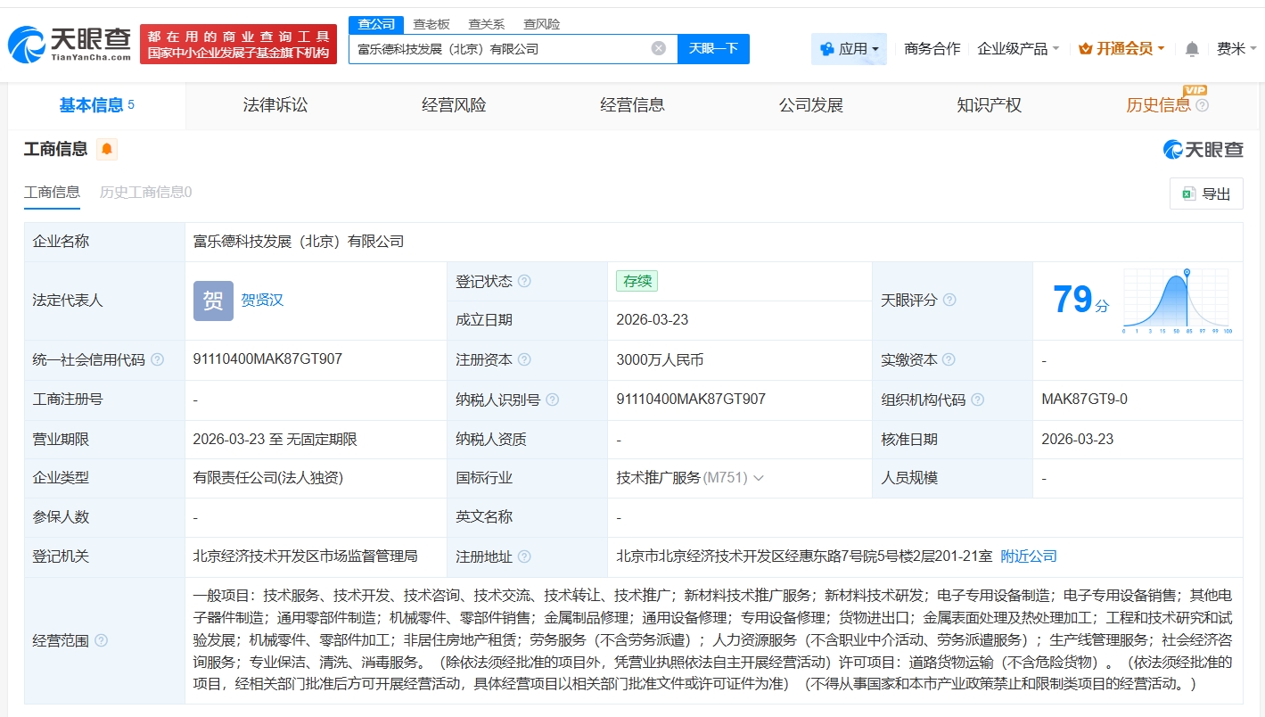 每经AI快讯,天眼查App显示,近日,富乐德科技发展(北京)有限公司成立,法定代表人为贺贤汉,注册资本3000万元人民币,经营范围包括新材料技术研发、新材料技术推广服务、电子专用设备制造、电子专用设备销售等,由富乐德(301297)全资持股。