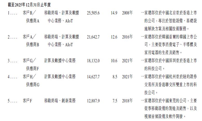 报告期内,公司的前五大客户与前五大供应商存在较高比例的重叠。以2025年为例,客户B同时也是公司的最大供应商(即供应商A)。数据显示,2025年公司对客户B的销售额高达255.06亿元,占当期总收入的14.9%;与此同时,公司向该客户(供应商A)的采购额也达到188.92亿元,占当期总采购额的12.1%。类似的情况也发生在其第二大客户(客户A,即供应商B)身上,2025年公司对客户A的销售额为216.43亿元,占总收入的12.6%;对应的采购额则高达77.37亿元,占总采购额的5%。
